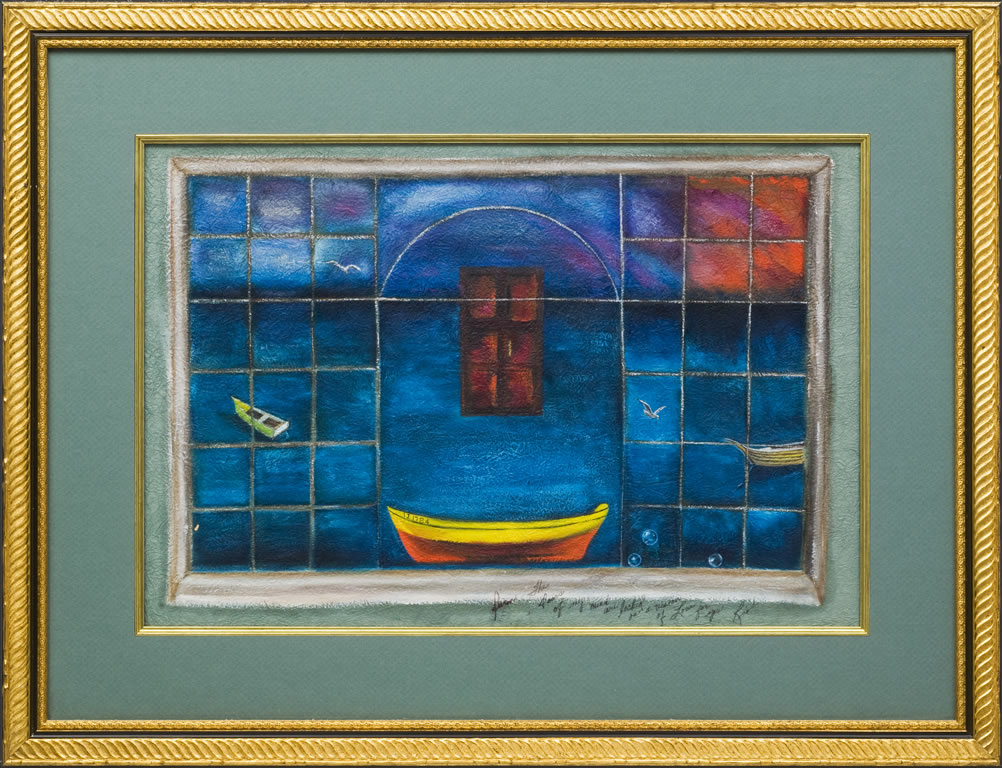 JOURNEY FOR DARON, oil on paper painting, signed and inscribed across bottom of painting “Daron, the doors of my mind are locked on a vision of love for you, Rio”; depicting a wide blue sea with a door suspended above the sea; a yellow dinghy at center fore; all through the grill of a window with arched center. Dimensions 16 inches high by 24 inches wide (sight size) and 25-1/2 inches high by 33 inches wide (frame). |