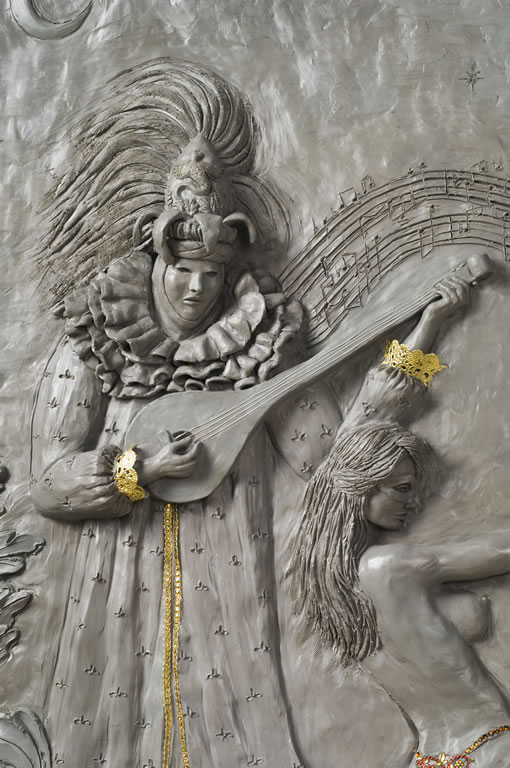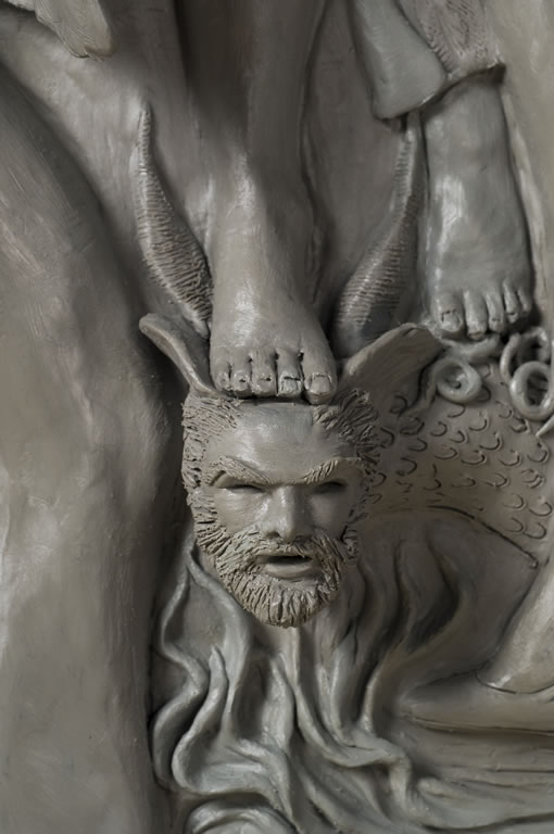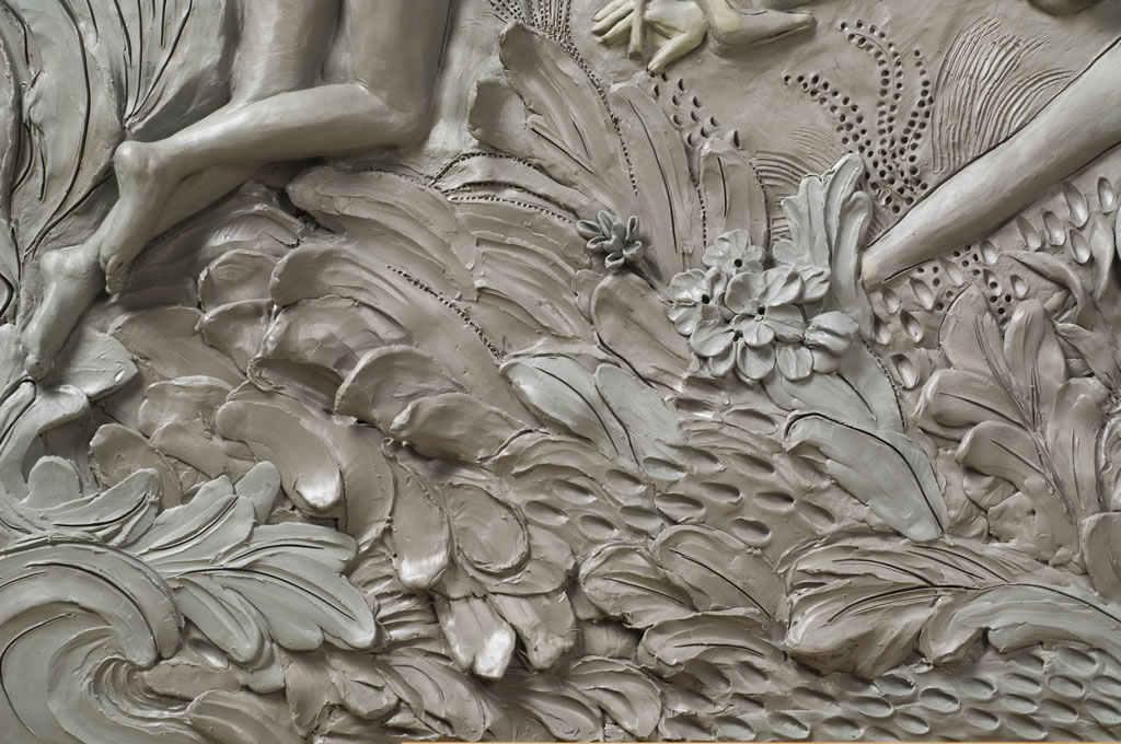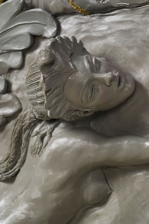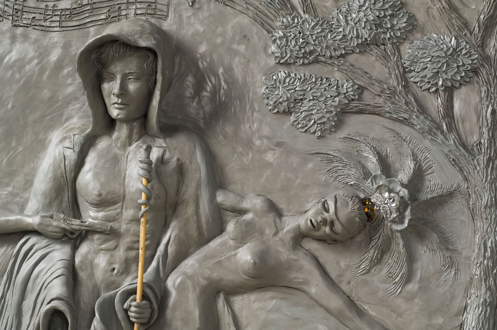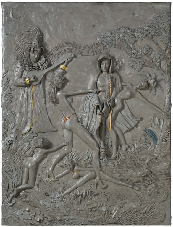 Dawn's Opera - Rio - Dawn Gallery DAWN’S OPERA, a plasticene on board bas-relief, work-in-progress, depicting “the Human Condition” with the central figure of Narcissus; two women on either side battling it out over him; the “wizard” to left rear; and fallen figures at base; foliage and leaves around bottom right corner.